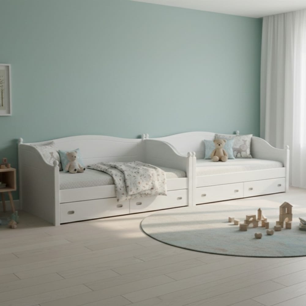 Масив (Чам, Бук, Дъб): Често използваме масивна дървесина за краката на леглата или носещите рамки, за да гарантираме, че мебелите ще издържат на активните игри на децата.