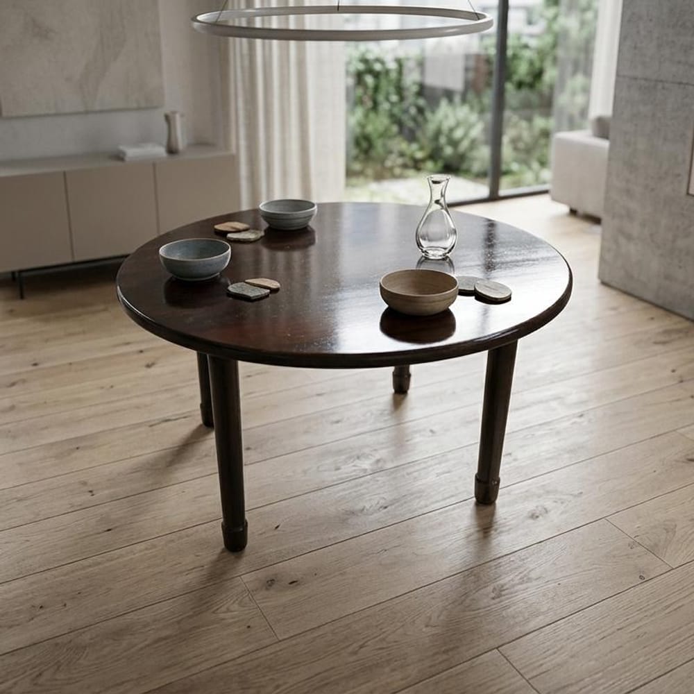Естествен масив: Използваме селектиран масив дъб, здрав бук или натурален чам. Кръглите плотове от масив изискват майсторско слепване, което подчертава естествения фладер и гарантира, че масата няма да се деформира.