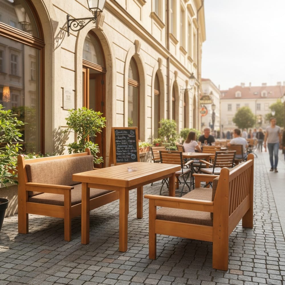 Масивно дърво: Използваме селектиран Дъб, Бук или Чам. Плотовете на масите са обработени така, че да издържат на ежедневна употреба, а конструкцията на пейките е усилена за максимална стабилност.