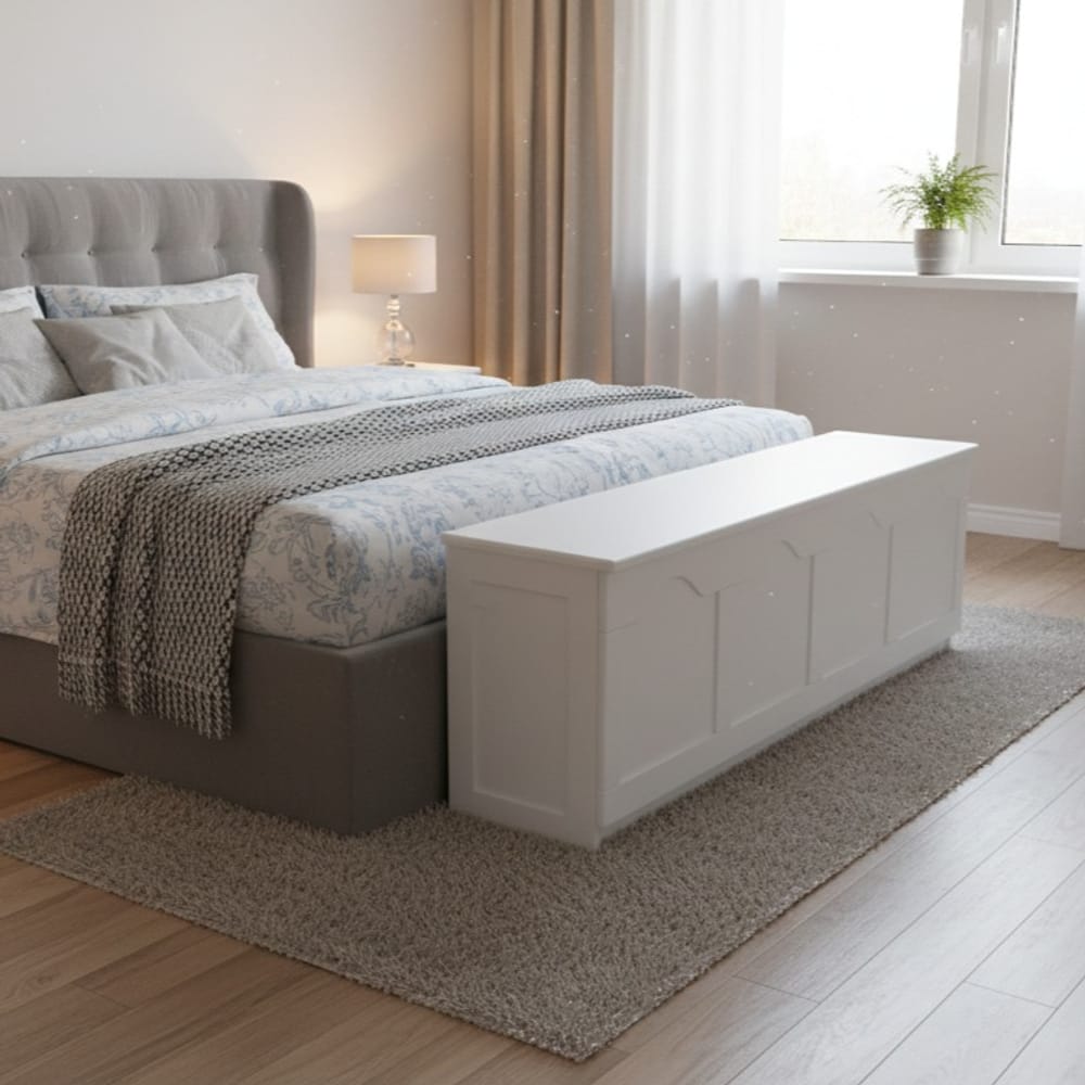 Мултифункционалност: Ракла-пейка с подсилен капак, която служи едновременно за съхранение и за сядане при преобличане.